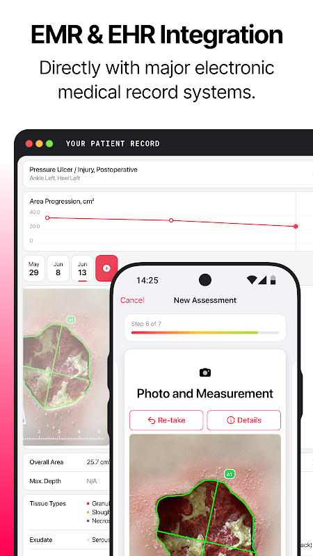 A guided assessment enables wound documentation in seconds. Flexible measurements with ruler or calibration marker ensure precision, while detailed capture of the wound and its surroundings provides comprehensive documentation. Instant PDF reports enhance teamwork, and seamless EMR/EHR integration streamlines existing workflows.