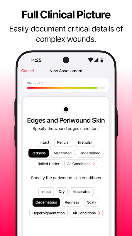 幾秒鐘內完成引導式傷口評估 無需打字,點擊即可開始。我們直覺的工作流程讓您透過選擇標準化選項來記錄傷口特徵。僅在需要時添加具體註釋。