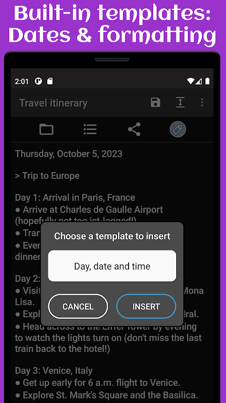 • 內建範本:使用非常適合日記、日記和筆記的日期、時間和格式範本。