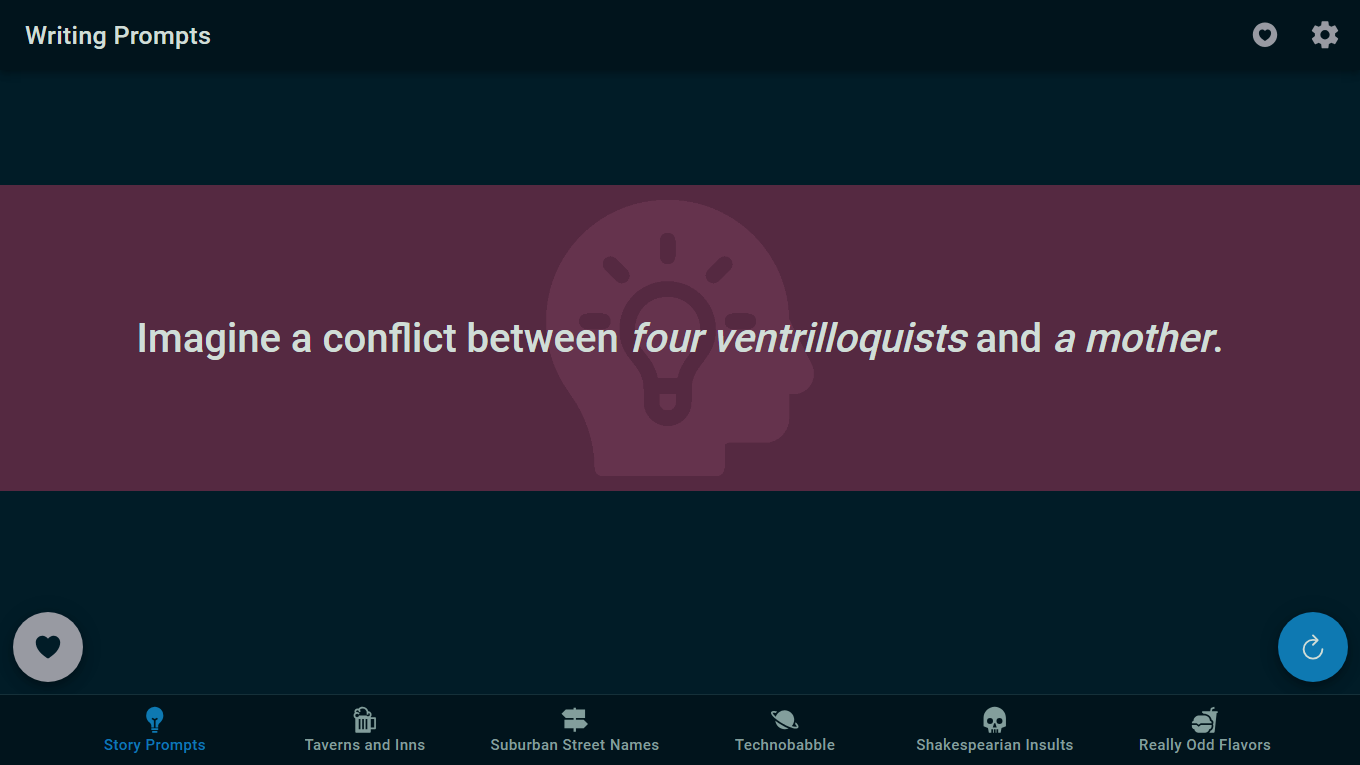 * 寫作提示 - 應用程式的主要工具。它試圖將兩個隨機的想法組合成可能激發一個想法的開始的東西。它可能對短篇小說更有用。您可以透過造訪設定頁面來限制出現的主題。