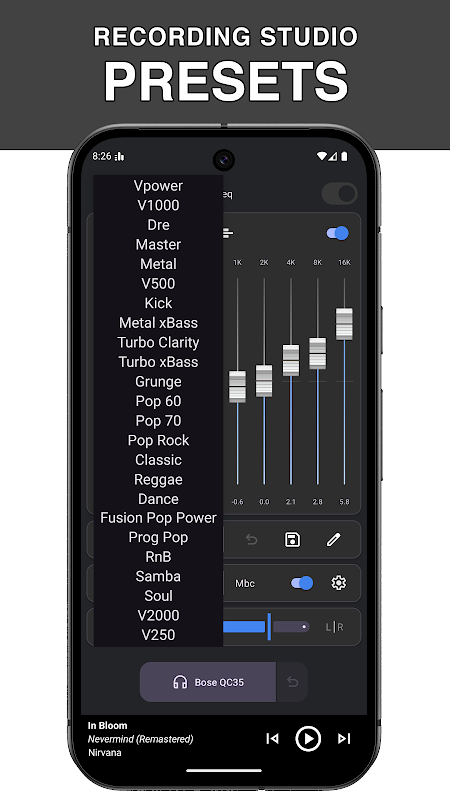 包含低音增強、清晰度、響度、人聲增強、平直、自訂混音預設等。