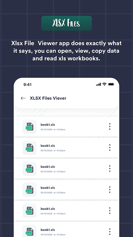 Xlsx File Viewer & Xls File Reader app provides you amazing features just like you can view and share your xlsx file quickly and easily. Xlsx file reader can manage your chart, data analyses and more while you are viewing your workbooks. Xlsx file viewer is a very flexible tool, you can manage xlsx files, xlsb files and xlsm files with xls file viewer app. Open and read xlsx file format with xlsx file reader and xlsx file opener. Xls file viewer has been made and available to users across the world. So the users who are always on the move can use this xlsx file viewer app to check their xls worksheet, xlsx workbook, xlsb workbook and view xls files.