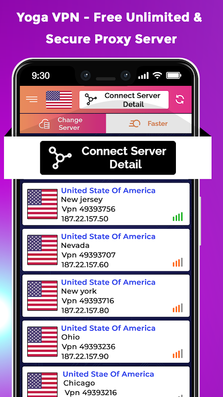 Yoga VPN - Free Unlimited And Secure Proxy app with you just needs to tap on the start button to download country list and tap on your choice country area and to access any blocked site to unblock it.