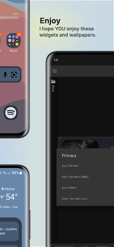 • 小工具會自動為您的牆紙設置主題。為了讓事情更有趣一點,這個包中的所有小部件都包括 KWGT 中每個小部件的全局設置!選擇使用默認的自動主題選項或選擇使用新的自動主題 2(測試版)[需要 KWGT 3.70+]。如果您想要更多控制,您可以選擇使用“Auto ReNoir”或“手動”顏色選項。