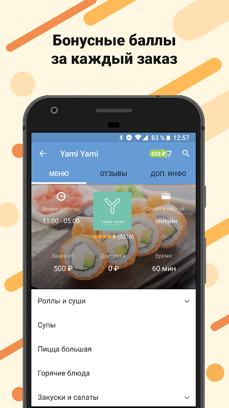 • И закажите любимое блюдо (пицца, суши, роллы, бургеры, пироги) всего в пару касаний.