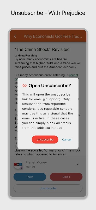 - 強大的退訂和攔截功能:厭倦了垃圾郵件和不需要的新聞通訊?只需輕觸即可輕鬆取消訂閱。封鎖特定電子郵件地址或整個域名,重拾平靜。