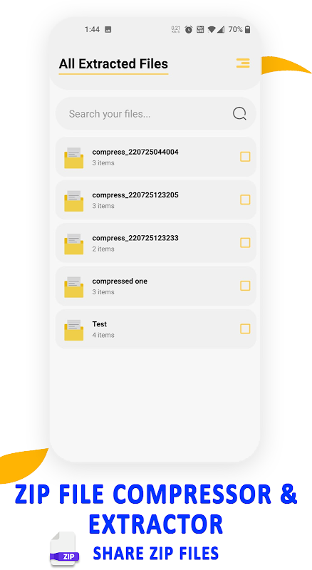Zip 文件閱讀器壓縮器和提取器應用程序將幫助您壓縮內部存儲文件,將其轉換為 zip 文件夾,並將其提取到內部存儲上。您不需要使用任何額外的工具來管理、壓縮和提取文件。