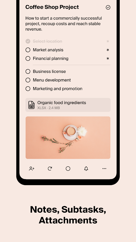 Note down your thoughts with rich-text editor or add subtasks if you need to split something into smaller tasks. Be on the road creating checklists to facilitate your event planning.