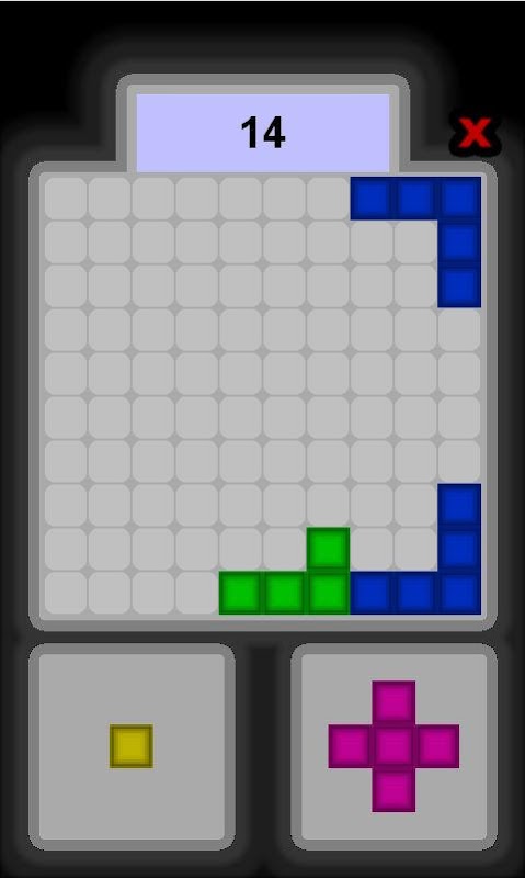 Simple puzzle game. choose between 2 blocks and drag into 10x10 board.