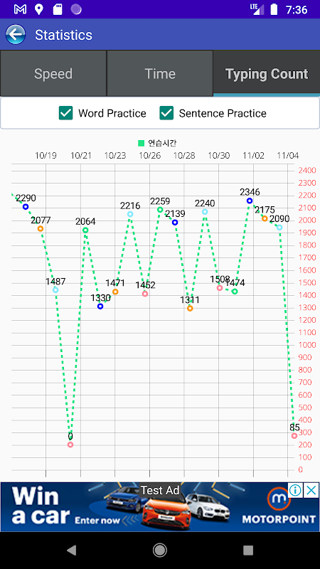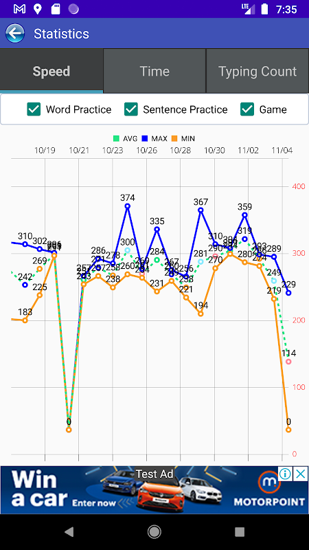 4. Statistics (shows speed/practice time/practice typing count by day)