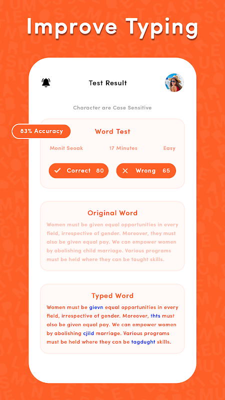 The app provides paragraph which you need to type. There's a time counter of 60 seconds. You need to type as much words as possible within 60 seconds. The score is in words per minute format. Each correct word will be added to your score and wrong typed word will not be counted.