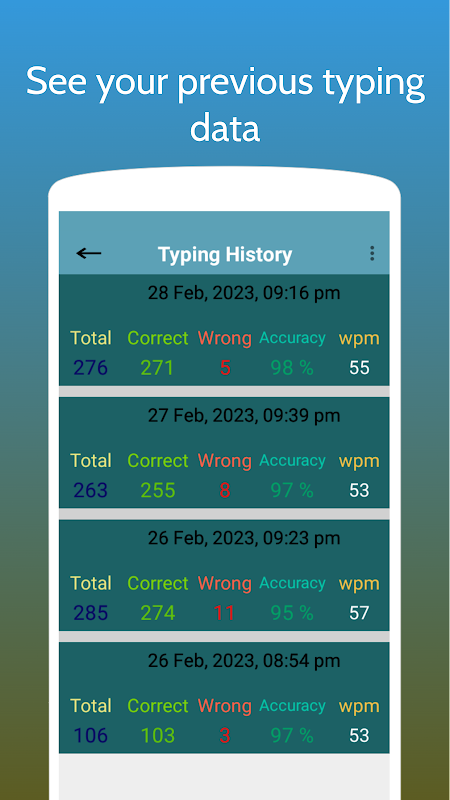 -Typing history. See your previous history and analyze and improve the speed and accuracy.