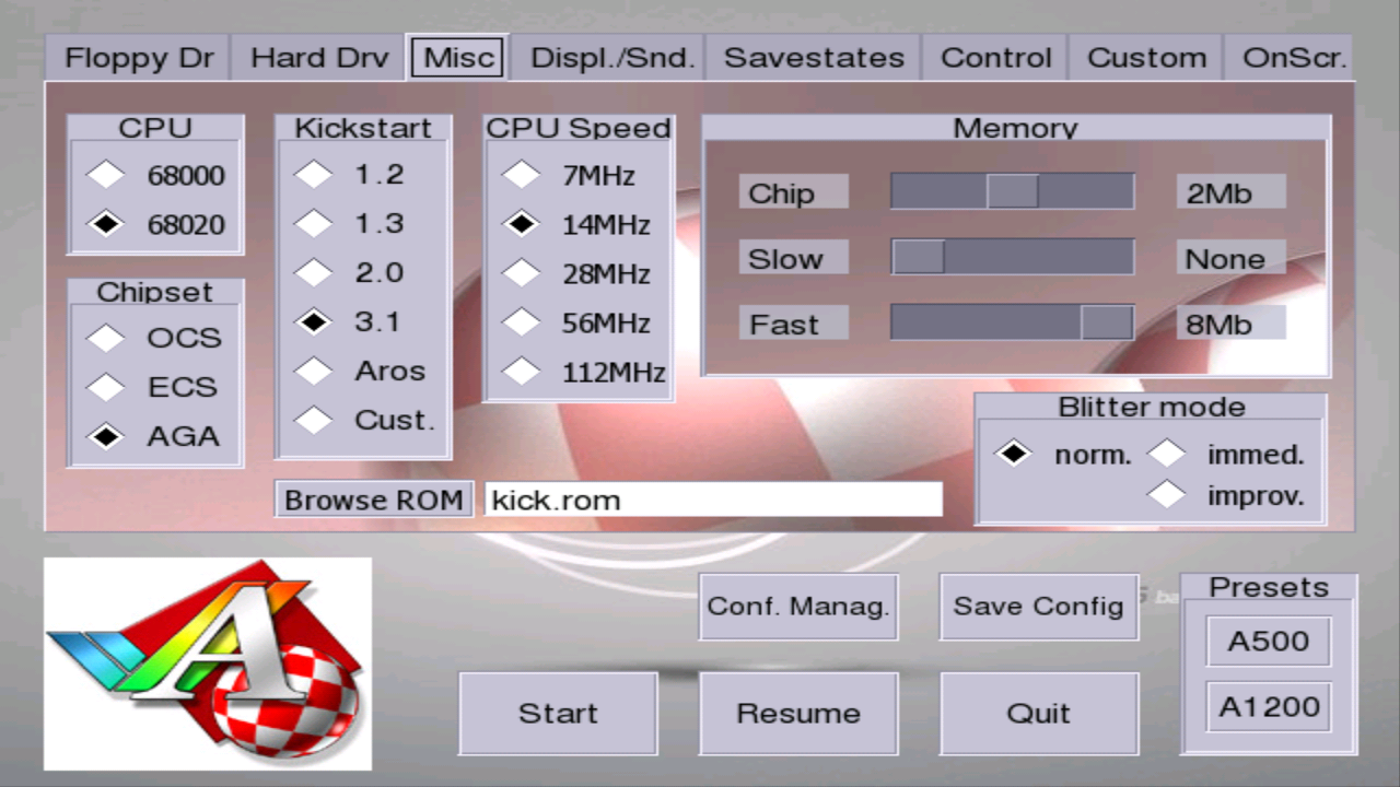Features: AGA/OCS/ECS, 68020 and 68000 emulation, harddisk-support, WHDLoad-support, Chip/Slow/Fast-mem settings, savestates, vsync, most games run fullspeed.