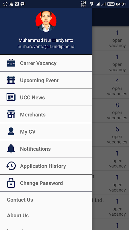 Aplikasi ini dikembangkan untuk memenuhi kebutuhan member Undip Career Center dalam mendapatkan kemudahan akses informasi lowongan pekerjaan yang diinginkan. Selain itu terdapat fitur edit CV dan apply online.