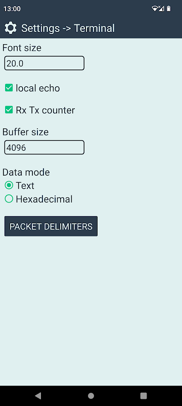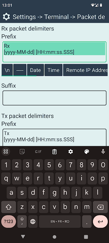 • configurable packet delimiters (additional text will be dispalyed in the terminal before / after the actual packet data)