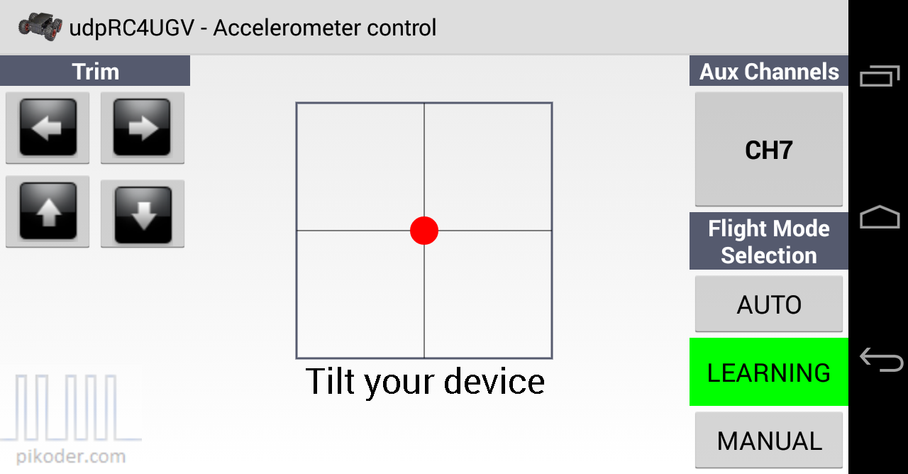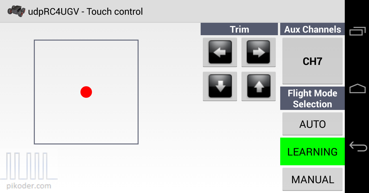 This App turns an Android device into an R/C transmitter for a rover with an Ardupilot Mega (UGV) or a similar autopilot. A PiKoder/SSC wRX receiver replaces the traditional R/C receiver as an interface between the smart device and the autopilot.