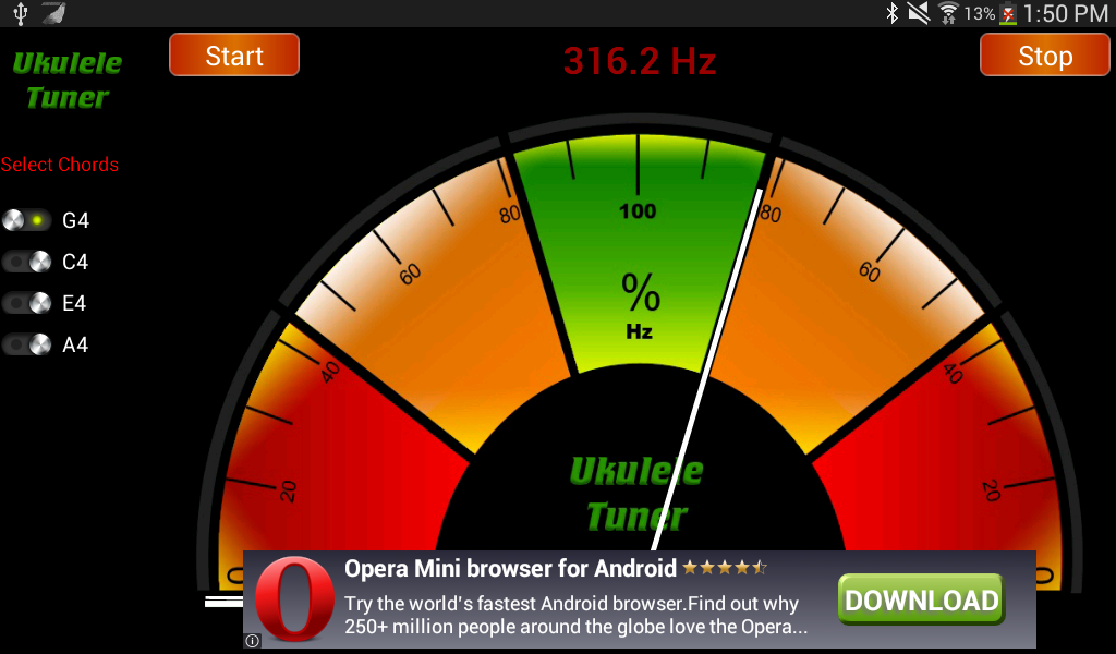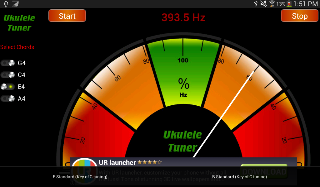 This tuner allows you to tune your instrument to tune according to E standard and B standard. Tune every string of your instrument and make your device sound better and feel alive.This ukulele tuner uses a combination of probability theory and Fourier Transforms to provide the best chromatic tuner for string. This specific tuner is aimed at those who play the ukulele, you should be able to swiftly and quickly tune your ukulele and not break any strings. I have sample notes for G String, C String, E String, and A String all at the right octave to ensure speed and accuracy for ukulele tuning.