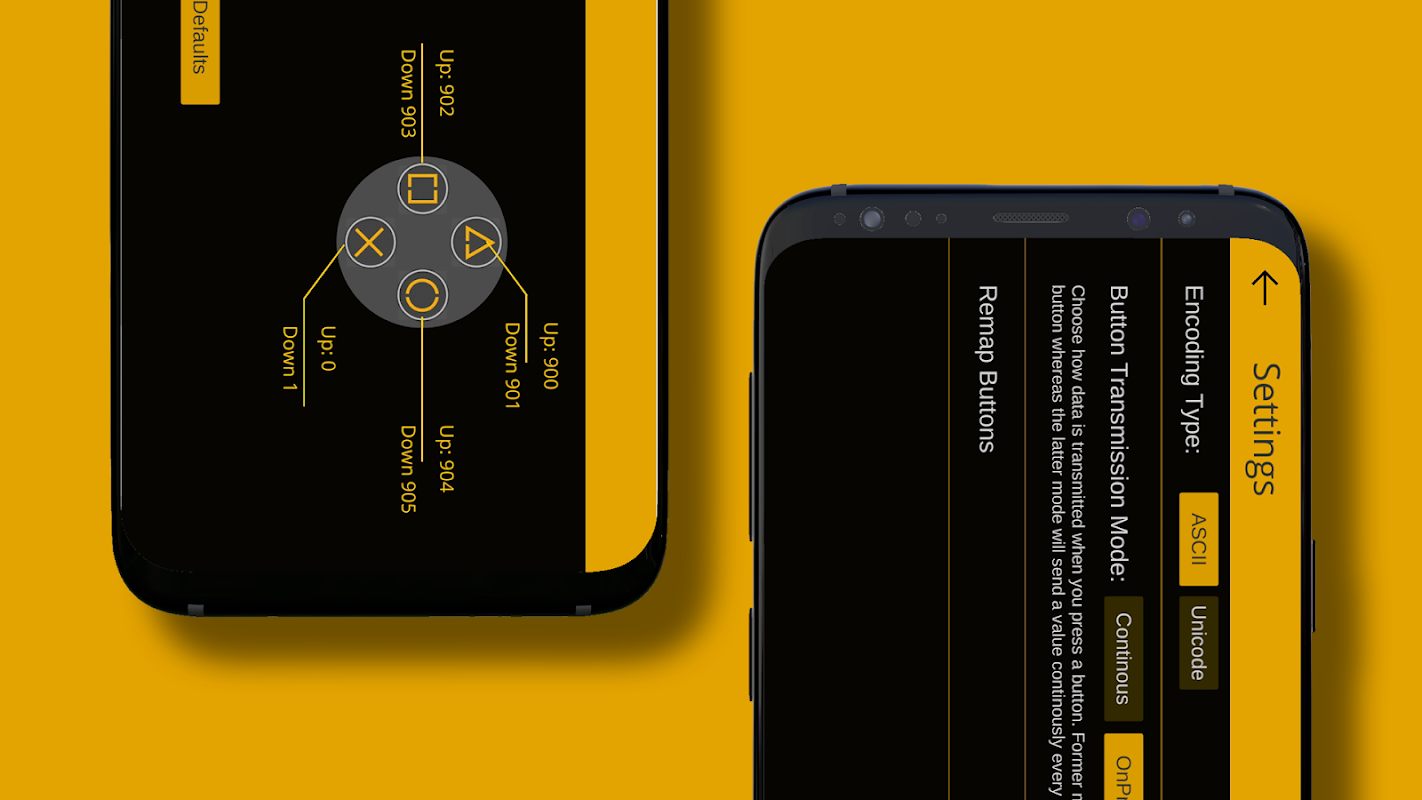 You can customize the data sent to the bluetooth module connected to an arduino on each button press and choose between 2 data transmission modes: Continuous and on press/release. This will decide whether data is sent continuously or on every button press and release, to the bluetooth module attached to an arduino.