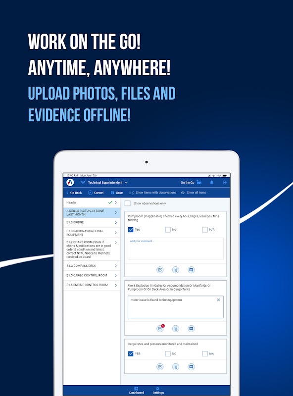 Task Assistant Inspection Module is available on the Tablet for onboard and office users.