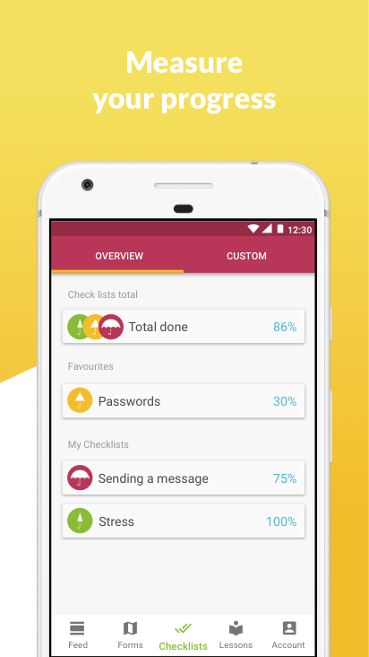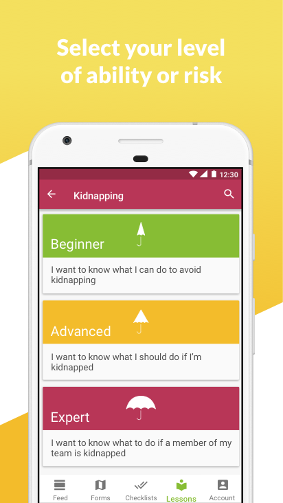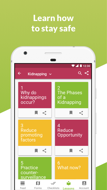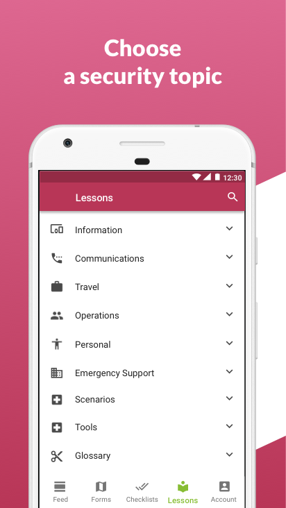 Lessons help you learn about a topic, checklists help you follow through. Keep track of your progress in the dashboard. Report incidents with forms. Feeds update you with threat alerts from trusted sources like the UN, ReliefWeb, Global Disaster and Alert Coordination System and Centres for Disease Control.