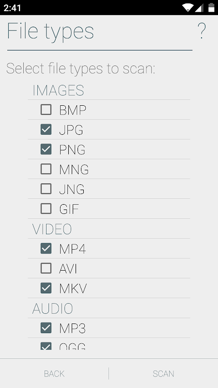 Deep scan heuristically scans for and recovers the following types of files: BMP, JPEG/JPG, PNG, MNG, JNG, GIF, MP4, AVI, MKV, MP3, OGG, OGM, WAV, FLAC, AMR, MP4A, PDF, SXD, SXI, SXC, SXW, ODT, ODG, ODS, ODP, DOCX, XLSX, PPTX, ZIP, JAR, APK, EPUB.