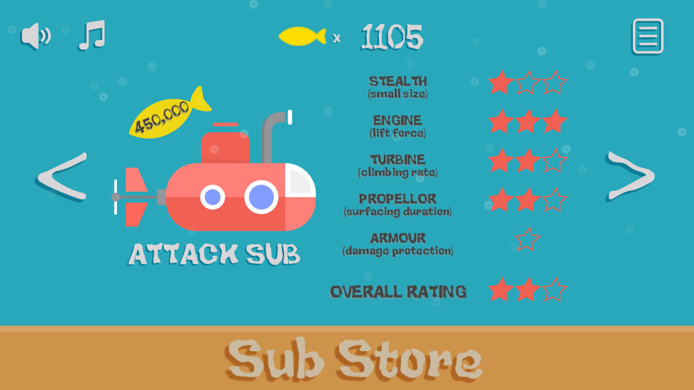 Upgrade your Sub at the Sub Store and add special features like armor. Several amazing Subs available, including the Attack Sub, Research Sub, Diesel-Electric Sub, and Nuclear Sub!