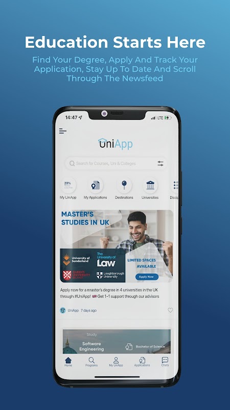 UniApp brings you top degrees from universities and colleges to study in Europe, the United Kingdom, the USA, Australia, Canada and many other countries. UniApp is easy to use; in short, as a student, all you need is to complete your UniApp profile; after completing it, you will be able to apply to multiple degrees in one single click.