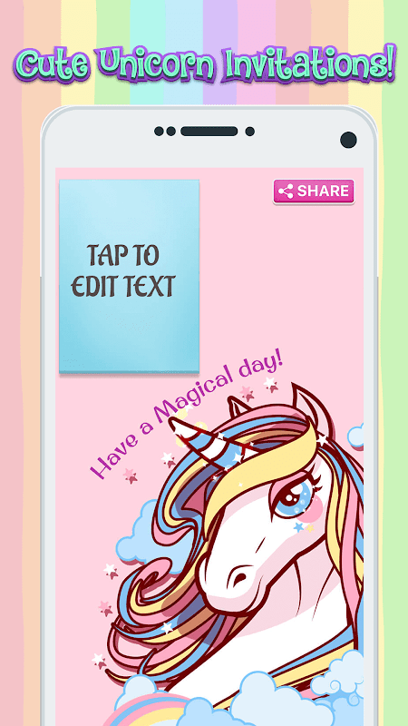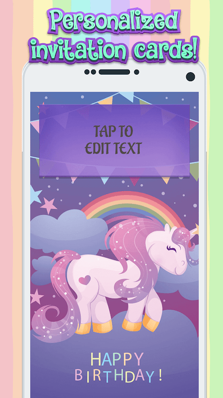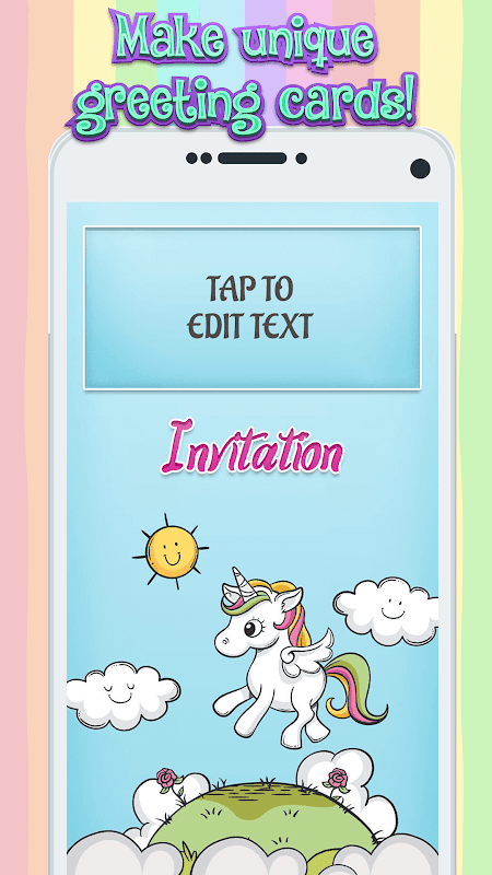 Surprise your dear ones with an amazing party that you will throw for them and use this invitation e card design app to make your own invitation cards for all occasions and send e-cards for the celebration party. It's so much fun and it's so easy that everyone can do it. Get now kawaii invitation templates for free or free unicorn invitations free templates, surprise your kids and make free unicorn invitations for birthday party using this fabulous birthday invitation maker. You can use it as a wedding invitation e card design app or engagement invitation e card design app, too, and turn it into a wedding invitation maker, showing your creativity to everybody. Download today 🦄 Unicorn Invitation Maker 🦄 free and create lovely invitation cards for free or greeting cards for all occasions! Get this fun app right now and celebrate with all your dear people!
