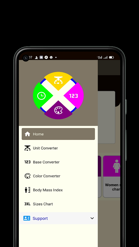 Unit Conversion Pad is a simple and easy to use utility app that will help you for your everyday conversion need. It has 5 converters that are categorized into Unit converter, Base converter, Color converter, Body Mass Index and Sizes chart.