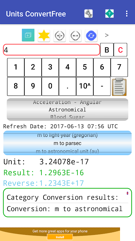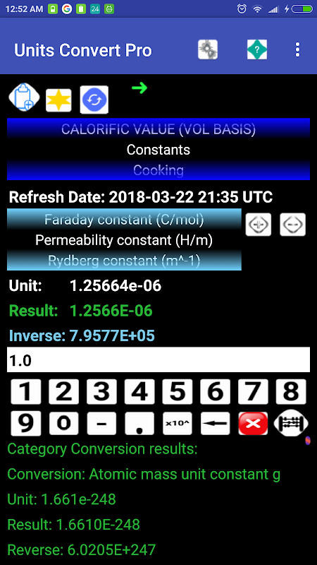 Features various predefined conversions and also allows for user created unit conversions to be entered in the app.Easy to use, just swipe left - right across to change screens. Select your Unit Group from the list, select the required conversion from the Types list. Once selected the conversion value will be displayed below. Below that is the calculated result from the Entered data (which defaults to 1). Below the calculated result is the Reverse Direction. i.e. the opposite conversion direction to the one selected.So 2 results are shown i.e. the result for 1 cm to m and the reverse result 1 m to cm would be displayed if 1 cm to m was selected. Calculations are preformed