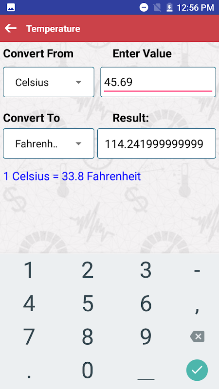 Unit Converter App allows a simplest way for quick and accurate conversion of all types of measurement units. This App is useful for engineers or anyone else whose activities require working with quantities measured in different units. You can use this unit converter app for converting different types of unit such as Temperature Length Energy Area Speed Digital Storage Volume Frequency Plane Angle Power Mass Fuel Economy Pressure Time Data Transfer Rate unit.