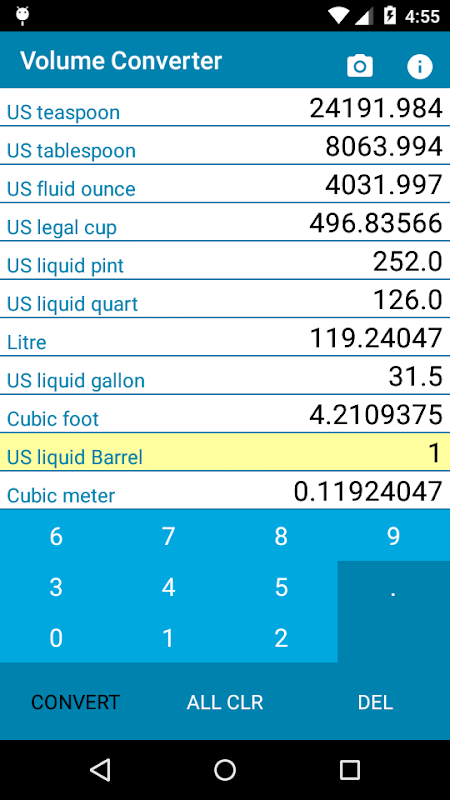 This app converts and shows volume in 11 different units like US teaspoon, US tablespoon, US fluid ounce, US legal cup, US liquid pint, US liquid quart, Liter, US liquid gallon, Cubic foot, US liquid barrel and Cubic meter. All the values can be read at a time as they are displayed on single screen.