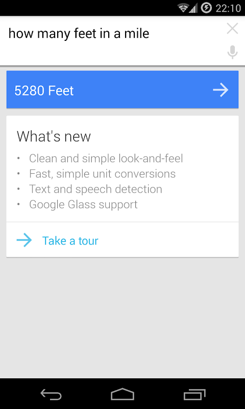 The app supports free-form typing, so feel free to ask it questions like "How many feet in a mile?", "Convert 15 tsp to tablespoons", and even "1 USD to BTC". Everything except currency conversions will work offline. Hit Convert for even more options.