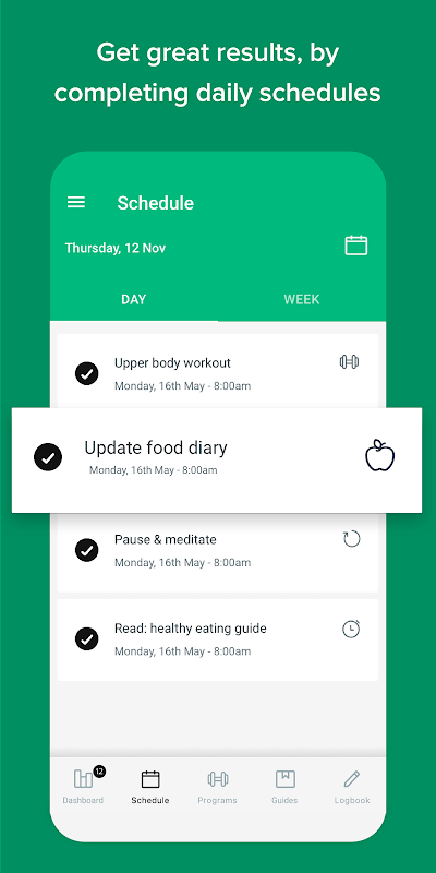 - Food diary with optional MyFitnessPal sync to centralize calories and macro data.