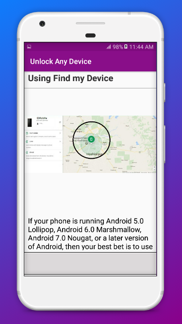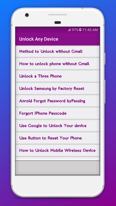 Unlock Any Phone Methods and Tricks is a free guide to make secure and protect your data. To avoid unauthorized use of his data, you need to protect your data. There are multiple methods to protect any phone's data i.e. to lock phone screen by pattern, pin or using other methods such as face recognitions. This app provides complete guidelines those are helpful in solving problems relevant to device lock or unlock. Easy Unlocking methods and processes are properly explained in it.