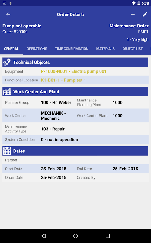 Access Work Orders, Operations, Equipment, Materials, Object Lists on the mobile device