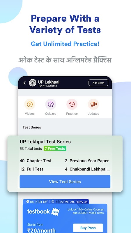 Testbook's UP Lekhpal Preparation App contains a wide range of study materials, including mock tests, study notes, exam notification and updates, previous year papers, smart analysis, and more. And the best thing is that all of the material is completely FREE.