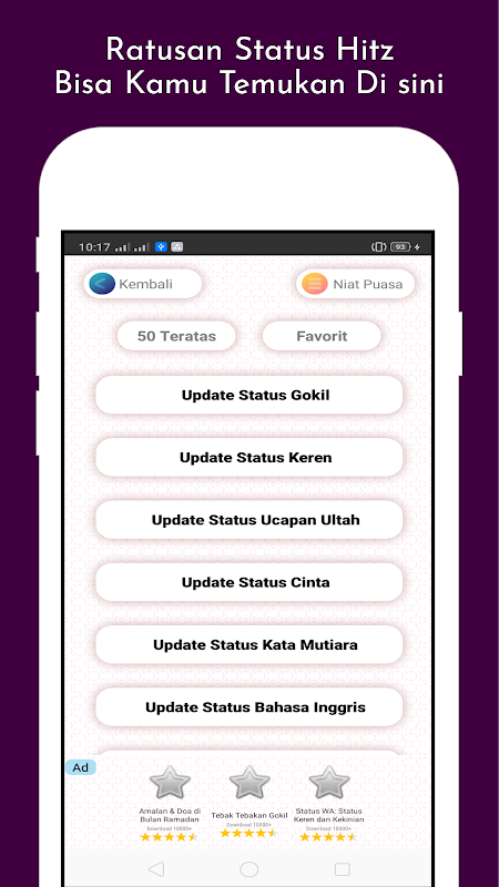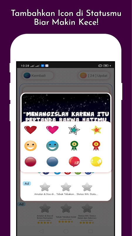 Bingung mau bikin status fb, caption ig hits, ataupun status wa keren kayak gimana? Daripada pusing-pusing mikir, mending langsung aja download aplikasi yang berisi ratusan status keren dan kekinian ini di smartphone mu. Dijamin bakalan dapet ratusan ide kata kata keren buat update status di sosmed.