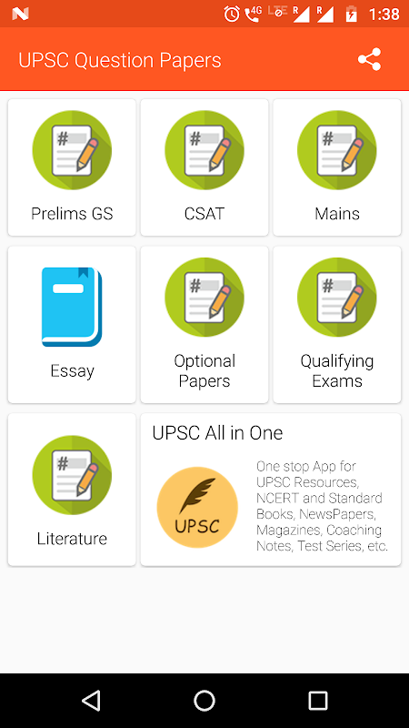 UPSC Question Papers includes previous year questions papers from 2011 to 2017. The application includes Previous year papers of Prelims (with answer keys), Mains - General Study, CSAT (with answer keys), Optional Subjects, Qualifying or Compulsory Subjects, Literature, Essay.