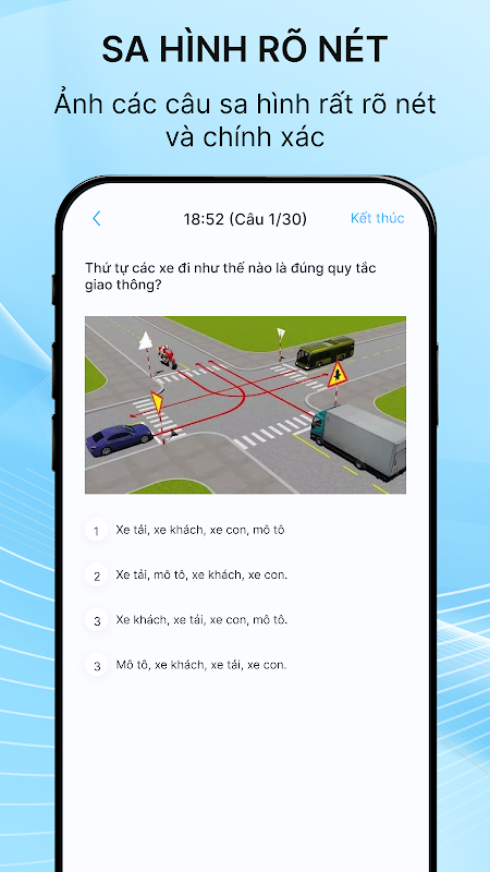 * بے ترتیب نمونہ ٹیسٹ میں وزارت ٹرانسپورٹ کے تحت ویتنام روڈ ایڈمنسٹریشن کے امتحان میں لاگو معیاری ڈھانچے کے مطابق ہزاروں ٹیسٹ سوالات شامل ہیں۔ یہ ایک مشق کا ذریعہ ہے جو ڈرائیونگ لائسنس کی اقسام B1, B2, C, D, E اور F کے لیے موزوں ہے۔