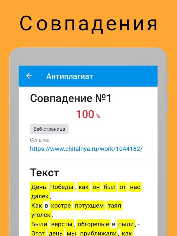 فنکشن ڈیفالٹ کے لحاظ سے فعال ہے۔ جانچ پڑتال کے بعد ، متن کو پیلے رنگ کے مارکر کے ساتھ اجاگر کیا جائے گا - یہ وہ متن ہے جو نیٹ ورک پر پایا گیا تھا۔ پائے گئے نتائج کی جدول میں ، آپ علیحدہ علیحدہ ذریعہ منتخب کرسکتے ہیں جس کے لئے قرضے لینے والے الفاظ یا فقرے ملے تھے۔