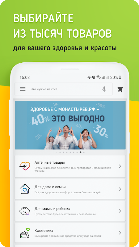 Мы делаем процесс покупки максимально удобным и быстрым. Огромный ассортимент лекарственных препаратов, медтехники, косметики, товаров для мамы и ребенка, средств гигиены и многого другого – в постоянном доступе на вашем смартфоне.