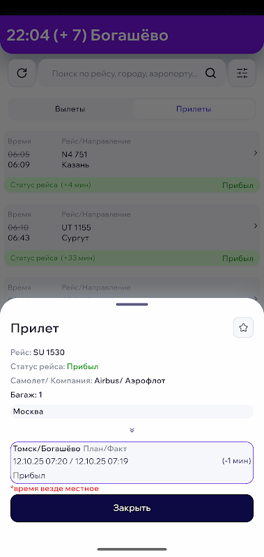 بوگاشیوو ہوائی اڈے (ٹامسک) پر روانگی اور آمد کے حالات کے بارے میں معلومات کے ساتھ ایک غیر سرکاری ایپ۔ مزید برآں، اس میں فلائٹ شیڈول اور دیگر مفید معلومات شامل ہیں۔