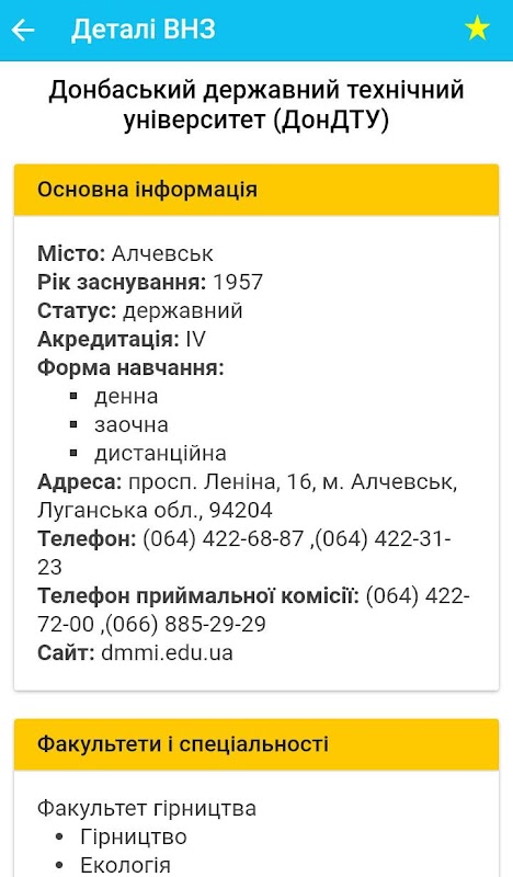 В мобільному додатку є інформація про всі вищі навчальні заклади країни. По кожному ВНЗ є найважливіші дані для абітурієнтів: рік заснування, ступінь акредитації, форми навчання (очна, заочна, дистанційна), перелік факультетів та спеціальностей. У додатку можна одразу ознайомитися з умовами вступу і переліком документів, необхідних для подання у вищий навчальний заклад.