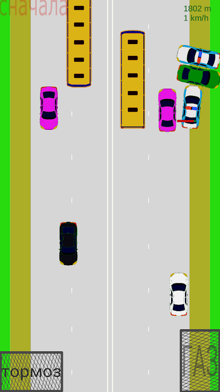 Управление сложное — повороты только наклоном телефона, ускорение и торможение — клавишами на экране.Игру можно перезапустить сначала, нажав на кнопку в верхней левой части экрана.