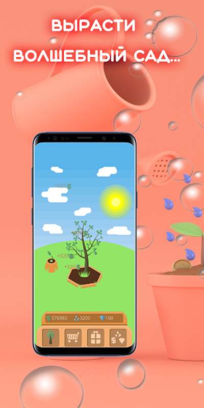 Накликай себе Миллионы. Расширяй и улучшай свой сад. Используй бустеры для ускорения процесса.