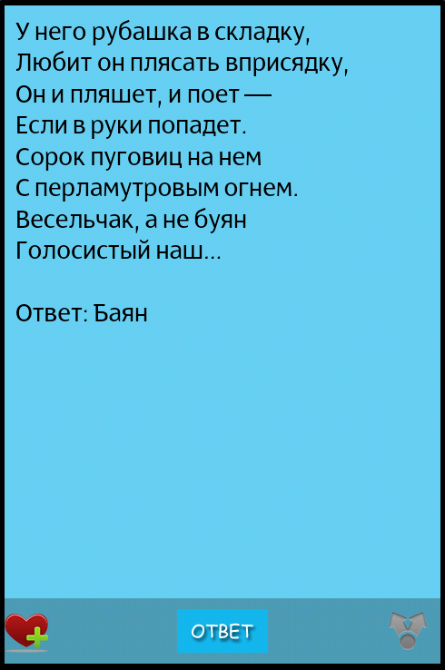 Все загадки в данном приложении с ответами, что позволит проверить и себя и своих малышей! Однако, помните, гораздо интереснее пытаться отгадать загадку самому, а уже после этого сверить свой ответ нажав кнопку ОТВЕТ.