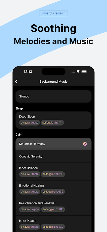 • سانس لینے کی آوازوں کی ایک صف میں سے انتخاب کریں اور اپنی پسندیدہ پس منظر کی موسیقی شامل کریں۔