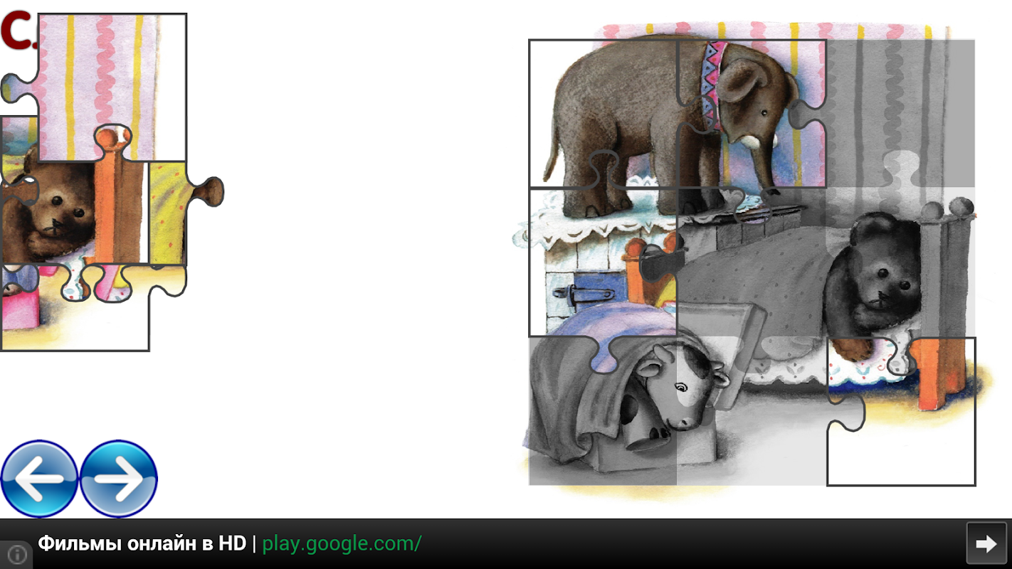 Три вида игр: пазлы, найти парные рисунки и стереть фигуру пальчиком.