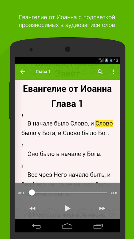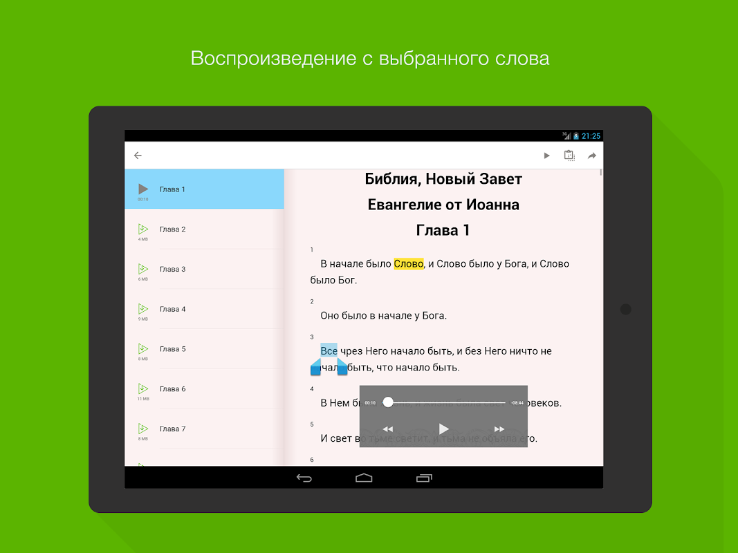 سننے کا اختیار آپ کو بائبل کی کہانیاں کی انوکھا ماحول میں ڈوبنے کی سہولت دیتا ہے جب پڑھنا ممکن نہیں ہوتا ہے (گاڑی چلاتے ہوئے ، بیماری میں)۔